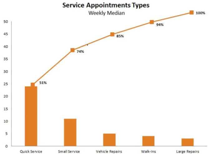 Here, I suggest grouping different service appointment types per period. However, someone may consider a different approach. Standard services to offer, resources, skill set available, or a source of appointments could also work with the Pareto Principle.